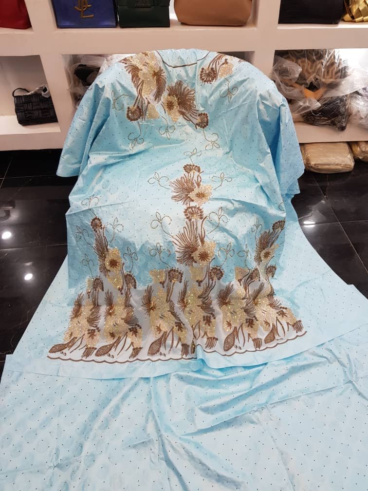 Bazin perlé Dubaï aux broderies florales or et bronze sur fond bleu ciel, alliant finesse et élégance. Disponible en boutique chez Titine Shop à Lambanyi, livraison possible à Conakry.