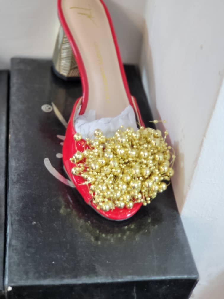 Mules talons vernies à pompon métallique doré stylée et confortable, adaptée à différentes occasions. Disponible en boutique chez Titine Shop à Lambanyi, livraison possible à Conakry.