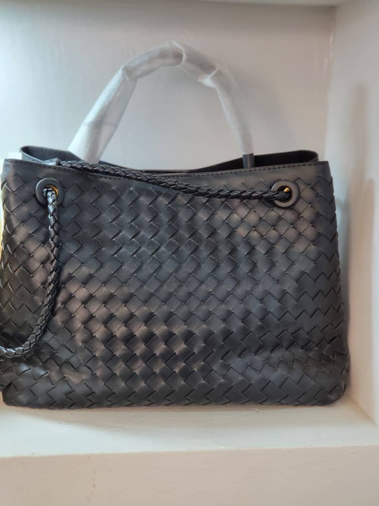 Sac cabas en cuir tressé Noir élégant et pratique, parfait pour compléter votre tenue. Disponible en boutique chez Titine Shop à Lambanyi, livraison possible à Conakry.