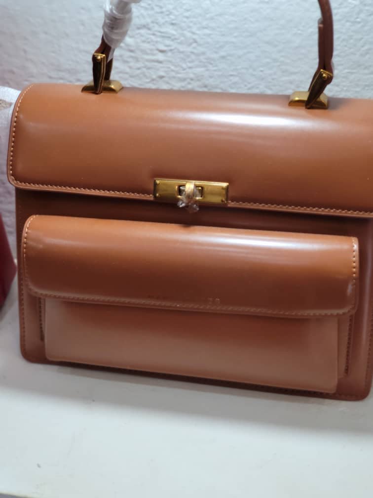 Sac cartable rigide à poche frontale camel élégant et pratique, parfait pour compléter votre tenue. Disponible en boutique chez Titine Shop à Lambanyi, livraison possible à Conakry.